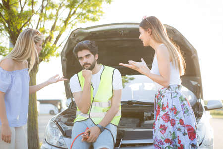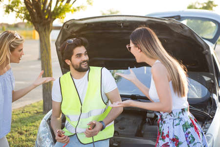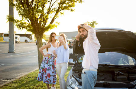 Three girlfriends got trouble during road trip out of city, open bonnet to check breaking details and try to calm down