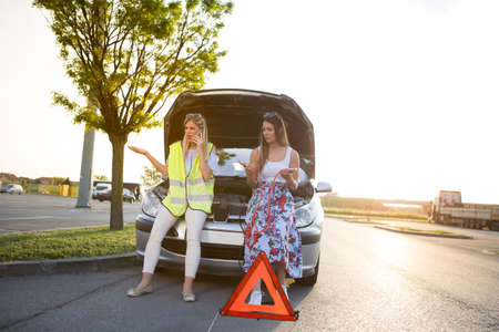 Young beautiful women stayed on the road with a broken car and now they are trying to find help.