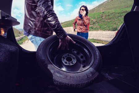 couple punctures a tire on a mountain road and while he takes out the spare wheel she calls for roadside assistance