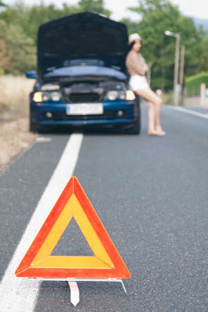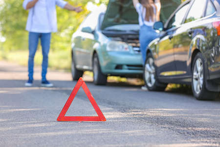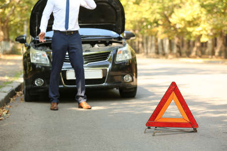 Broken down car. Vehicle engine motor problem concept. Auto accident triangle on road