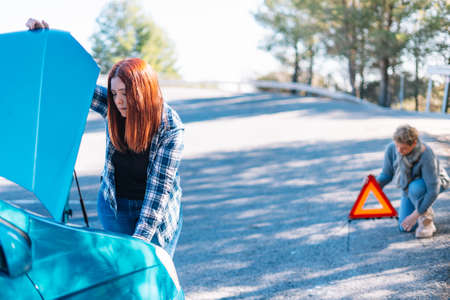 Two beautiful young women try to repair a broken car that has broken down on the road away from the city.