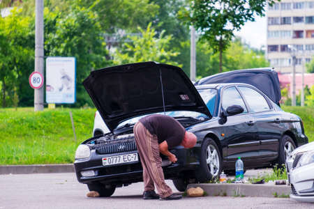 Minsk, Belarus - August 02, 2022: A man repairs his car on the street on his own