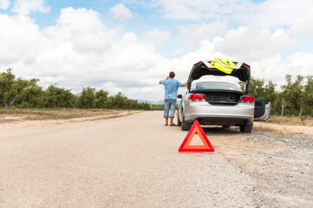 Car with problems and man put a red triangle to warn other road users. Male driver standing near a broken car with open up hood, waiting for help.