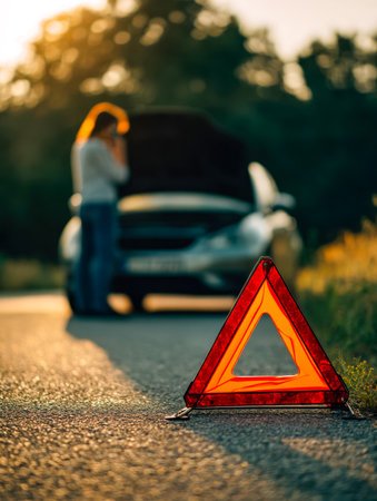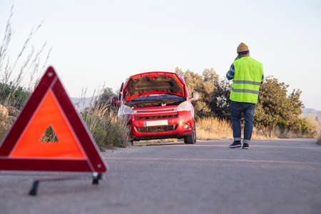 Red warning triangle with a broken down car,Emergency triangle on the road, stopped car and man calling by phone in the background.