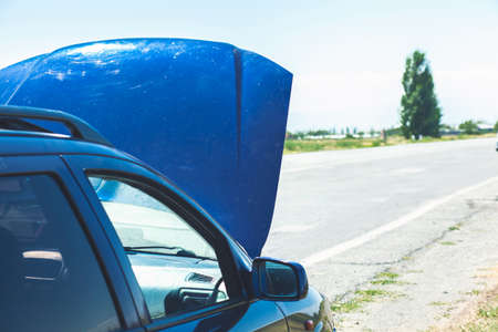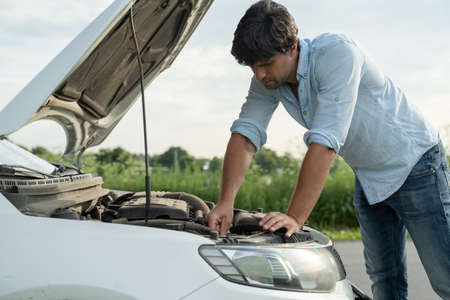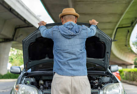 A man stands with his back and open the hood of his car to inspect a damaged engine at broken down car engine on street waiting for assistance to arrive or fix the vehicle.Broken car while traveling.