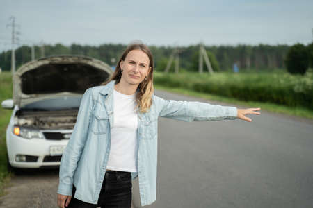 Young woman has a broken car and she catches a passing car