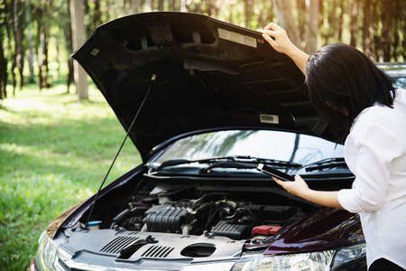 Action concept Women check and looking of Broken car on the country road