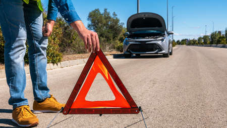 A car with a breakdown alongside the road, man sets the warning triangle