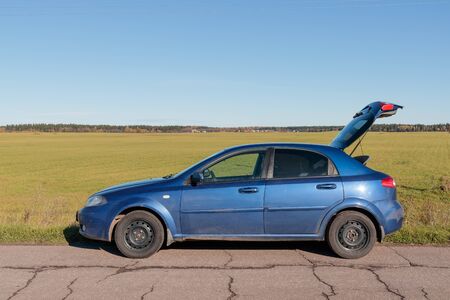 blue car that stands near the road