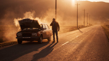 A worried driver stands next to a smoking car with an open hood on a rural sunset road, calling roadside assistance on his mobile phone to report an engine breakdown.