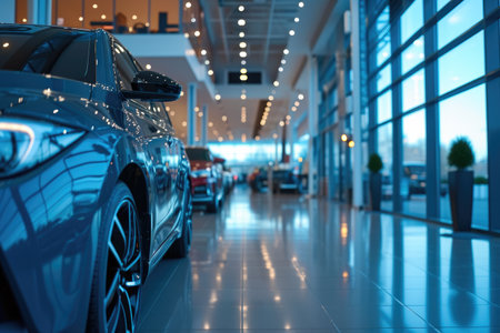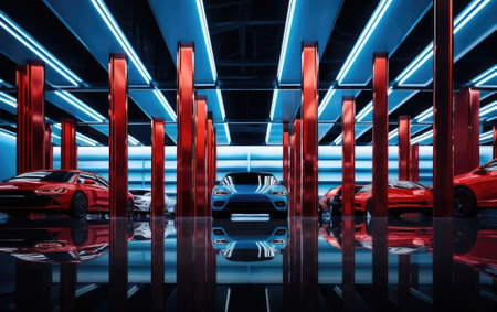 Modern car showroom with luxury vehicles displayed under futuristic lighting. That the image is generated using AI.