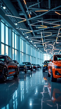 A vivid display of new cars in a modern showroom. Red and orange cars in the foreground emphasize the vibrant, sleek designs.