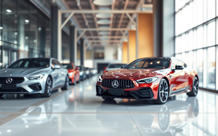 Showcase of luxury cars in a modern showroom during the day with bright sunlight illuminating the space