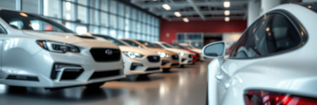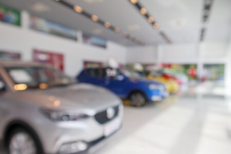 Blurred dealership store bokeh background, Cars soft lightning, Blur bokeh transportation concept dealer showroom background. Blurry