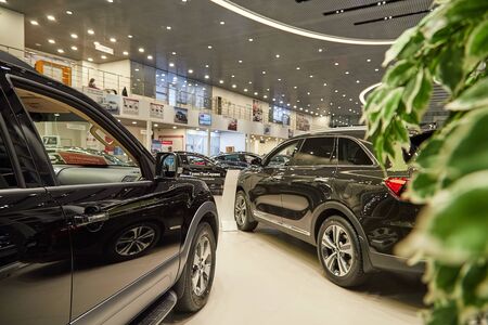 Kirov, Russia - March 07, 2019: Cars in showroom of dealership Kia in Kirov city in 2019