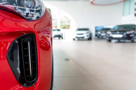 Blurred photo new red car parked in showroom. Car dealership office. Car parked in showroom with care. Auto for sale and rent business. Automobile leasing market. Electric vehicle. Luxury car company.