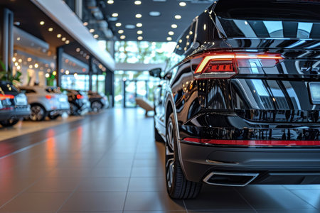 Luxurious black car displayed in modern showroom for sale and rent at car dealership office