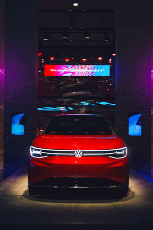 Berlin, Germany - July 30, 2019 : The metallic red I.D. ROOMZZ concept car in Volkswagen's showroom in Berlin