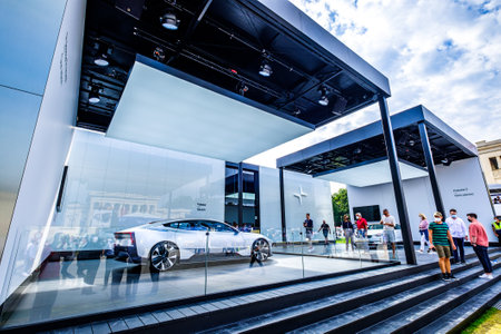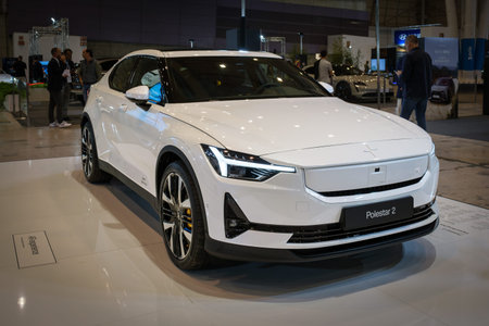 Lisbon, Portugal - May 12, 2023: Polestar 2 electric car on display at ECAR SHOW - Hybrid and Electric Motor Show