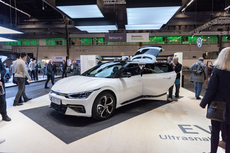 Munich, Germany - September 7: Audience at a car manufacturer's booth at the IAA (Internationale Auto Ausstellung - translation: international auto exhibition) trade fair in Munich on September 7, 2021
