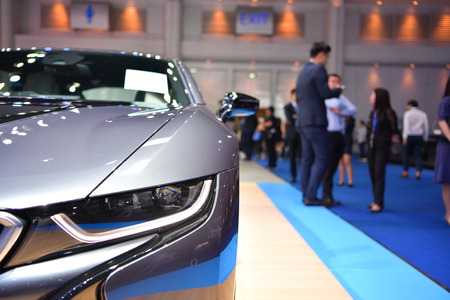 Blurred background of people attending in motor show exhibition event on Bangkok, Thailand