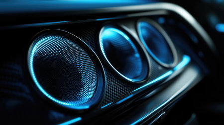 A captivating close-up view of a stylish car interior featuring vibrant neon lights and a high-quality sound system, showcasing modern design and technology.