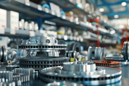 3d visualization of car components brake disk, oil filter, and belt pulleys in industrial setting