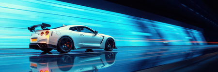 A sleek, modern sports car is dramatically showcased within a futuristic architectural environment, illuminated by vibrant neon lighting. This eye-catching digital art render features a luxury automobile with a glossy metallic finish, highlighting its stylish design and performance capabilities. The dynamic composition, with blue and pink neon reflections, creates an abstract and eye-catching background. Perfect for automotive design, technology, and urban lifestyle concepts, this image is ideal for marketing materials, website design, and creative projects.