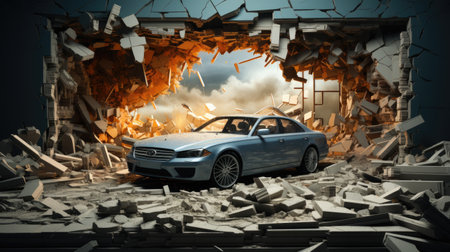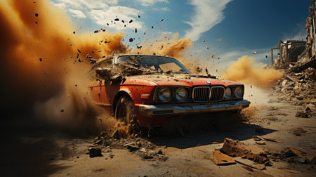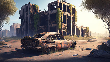 A destroyed car stands among the ruins of houses in a war-torn city, Generative AI content