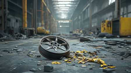 This image captures the essence of an abandoned warehouse, featuring a rusty car wheel on a debris-strewn floor, evoking themes of neglect and decay.