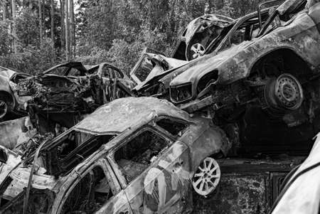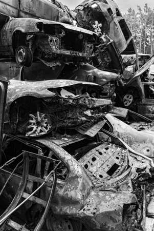 Dump of war-destroyed cars in Ukraine, black and white photo