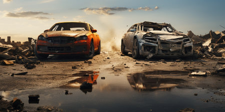 Abandoned and destroyed cars, post-apocalyptic look. sunny day