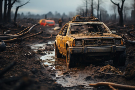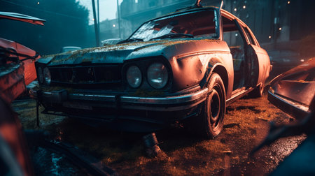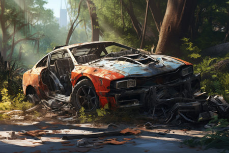 Crashed abandoned rusty expensive atmospheric suv as circulation banned for co2 emission 2030 agenda dystopian concept ai generated