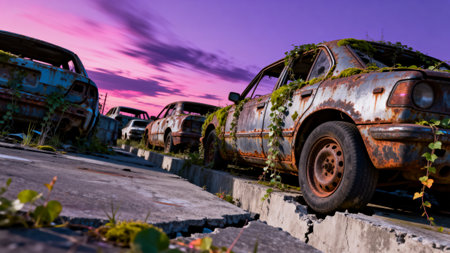 Abandoned car junkyard scrap metal sunset dramatic sky urban pollution decay destruction city