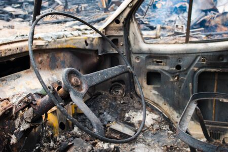 Burned car interior, close up vehicle fire, fires out. Burned automobile, car fire, vehicle fire due to short circuit, arson, smoke. fire damaged vehicle