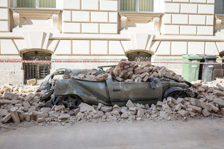 Zagreb, Croatia - March 22, 2020 : In the morning capital of Croatia, Zagreb has been hit by the magnitude of the earthquake 5.5 per Richter. Cars have been destroyed by fallen parts of the building.