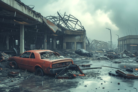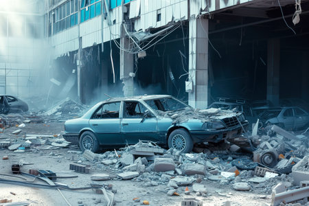 In aftermath of terrorist attacks, shopping center was destroyed and cars were damaged Generative AI