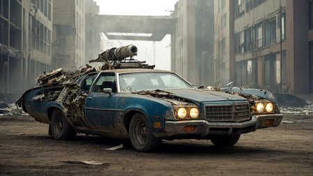 A weathered car, adorned with mechanical remnants, stands alone in a crumbling cityscape, suggesting a future once envisioned.