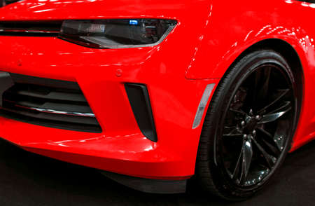 Sankt-Petersburg, Russia, July 21 2017: Front view of a red Chevrolet Camaro 2017. Car exterior details.