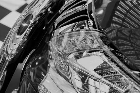 Sankt-Petersburg, Russia, January 12, 2018 : Mercedes-Benz AMG GTR 2018 V8 Bi-turbo exterior details, Headlight. Front view. Car exterior details. Black and white