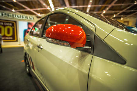 Zoom at sports car mirror and fender in Car show event with light bokeh at Bangkok, Thailand.