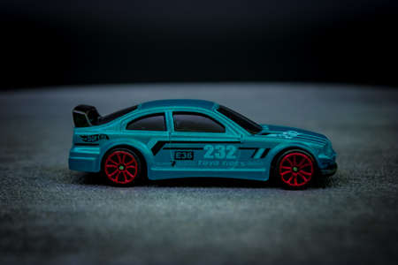 Close-up view of a children's toy car on a black background photographed indoors.