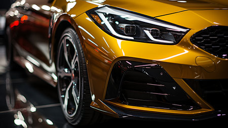 A closeup shot of a luxurious modern yellow car's front part
