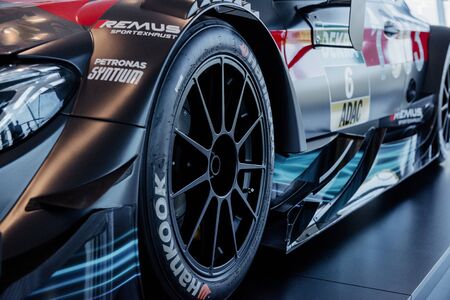 Kuala Lumpur, Malaysia – April 11, 2019 – Car and motocycle displayed at Moto Show in Kuala Lumpur. Exhibitors present most interesting aspects of the automotive industry. The image contains certain grain or noise and soft focus.