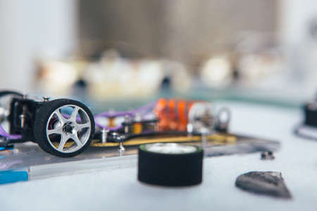 Close-up wheels and different parts of handcrafted miniature auto toy.