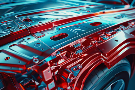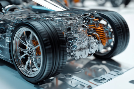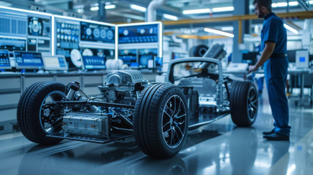 Explore an intricate view of an electric vehicle chassis displayed in a modern automotive laboratory, showcasing advanced engineering and innovative design techniques.