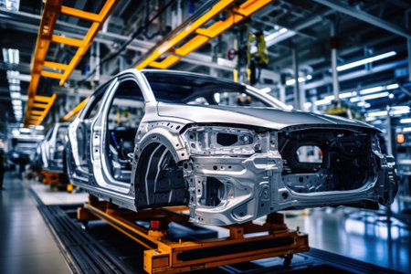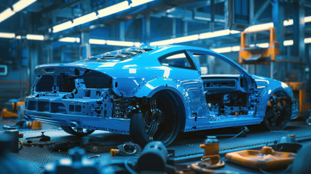 Car production line. Assembling a car on a conveyor belt. Close-up of a car body. Automotive industry Interior of a high-tech factory, modern production