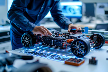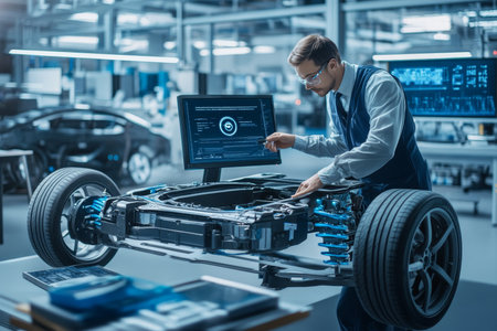 Engineer testing electric car chassis prototype with cad software in high tech development lab