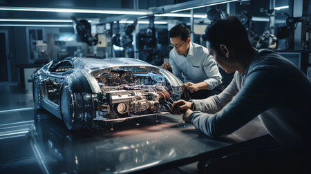 Professional technician checking and inspecting vehicle machine system while wearing formal cloth. Skilled automotive engineer designing and testing car design by using technology innovation. AIG42.