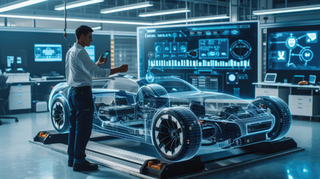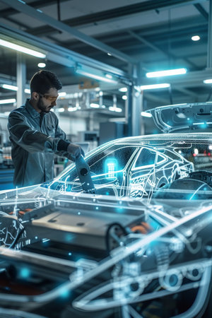 Advanced technology in car manufacturing automotive engineer at futuristic assembly line
